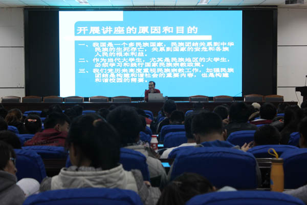 罗进德副书记首先说明宁夏作为回族的主要聚居地,如何处理好各民族关系是每位同学入校以来无法回避而且是必须面对的首要问题。随后,他从介绍当今世界的民族问题和民族工作的基本政策、宗教信仰问题、宁夏民族概况以及大学生如何处理民族宗教问题四个方面进行了详细阐述,尤其是从实际工作出发,结合大量的事例,讲述了自己在处理同学之间矛盾过程中的感受和体会,希望同学们加强民族团结、互相尊重、共同进步。