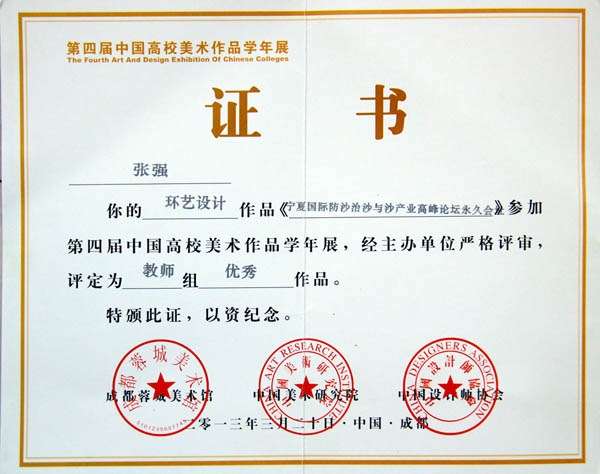 2013年3月,在由中国美术研究院、中国设计师协会、成都蓉城美术馆举办的“第四届中国高校美术作品学年展”中,德州扑克平台排名建筑与规划系教师张强的环艺设计作品“宁夏国际防沙治沙与沙产业高峰论坛永久会址”和摄影作品《小镇》,被评定为教师组优秀作品奖。同时,这两幅作品由第四届学年展组委会推荐,入编大型年度出版物《中国创意设计年鉴》正式出版。
