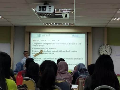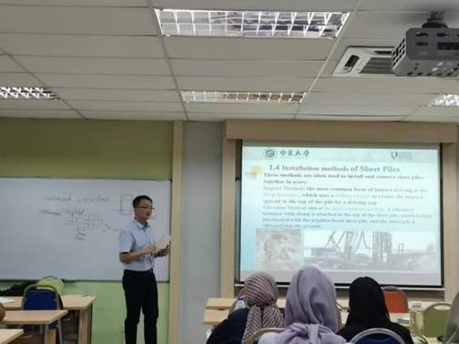 目前,学院已经分三批次向马来西亚派出多名硕士研究生和本科生。此外,为了做好国外留学生的教学工作,学院先后派出近十名教师赴美国、马来西亚、英国和澳大利亚等国开展为期一年的交流学习,旨在提升教学理念和改进授课方法。近日,前往马来西亚彭亨大学的5名教师圆满完成了专业课英语授课工作,并得到马来西亚学生的广泛欢迎和校方的充分肯定。在彭亨大学,王斌教授以主题讲座形式介绍了中国钢结构发展进程;车佳玲副教授完成了《Reinforced Concrete Design 1》中《ReinforcedConcrete Slab Design》章节8个课时的教学工作;包超副教授完成了《Foundation Engineering》课程中两周共计12个课时的教学工作;李超超副教授和申晓晶老师共同完成了《Hydrology and Water Resource》部分章节的教学任务,并分别做了《水文模型-HMS模型》、《水文模型-SWAT模型》的专题讲座。