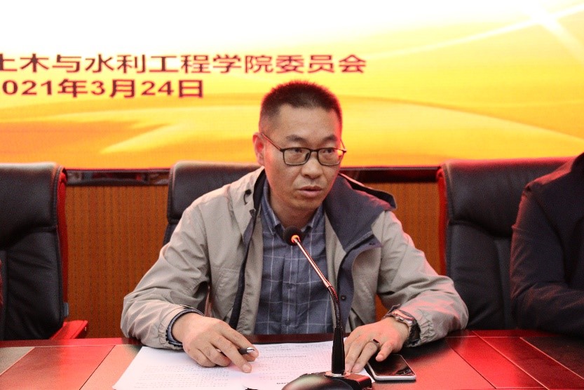 为贯彻落实学校党委党史学习教育部署要求,土木与水利工程学院于3�24日在知行楼三阶举行了党史学习教育动员大会。学院党委书记张晓天、党委副书记苏宇静、尹娟,党委委员、副院长刘海峰、李王成和朱磊出席会议。院长毛明杰列席会议,学院全体正式党员参加了会议。会议由学院党委副书记苏宇静主持�