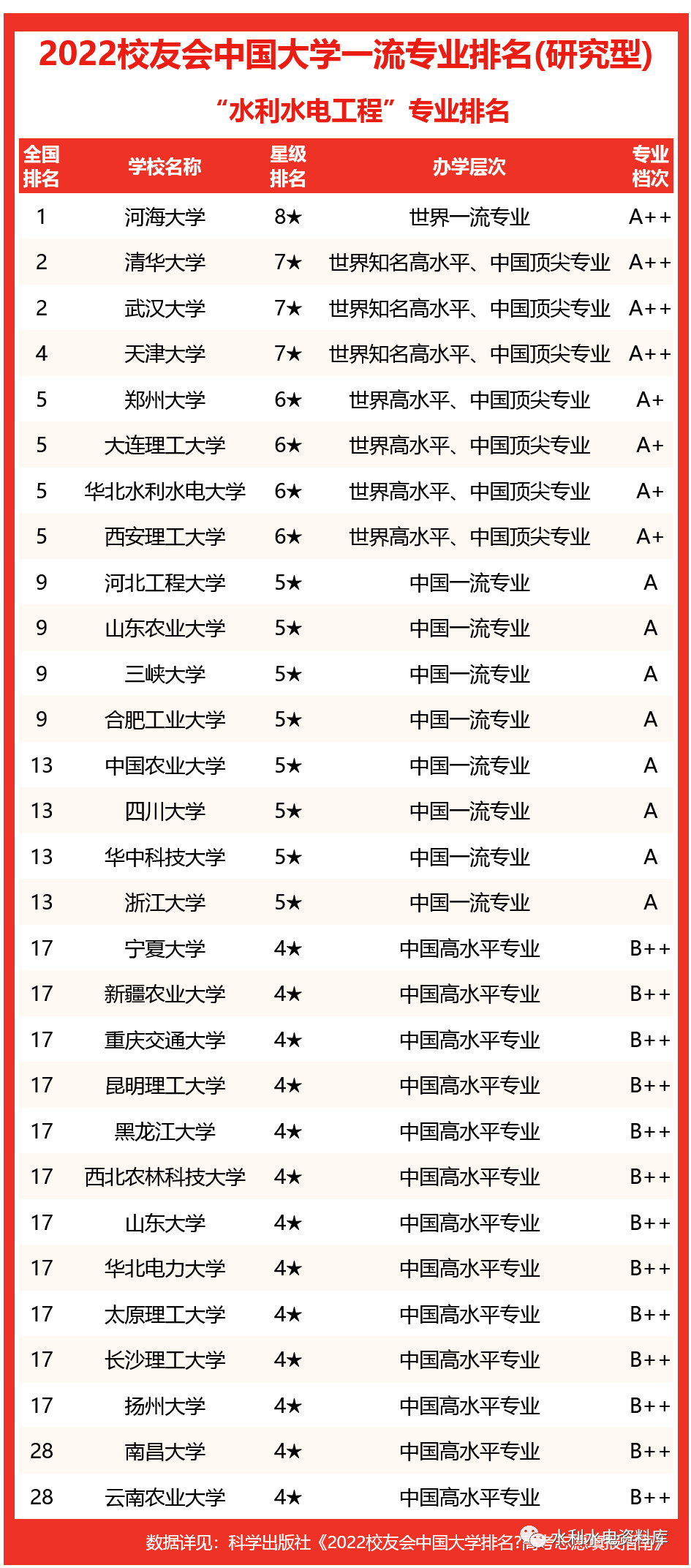 在最新校友会2022中国大学水利水电工程专业排名(研究型)中,我校德州扑克平台排名