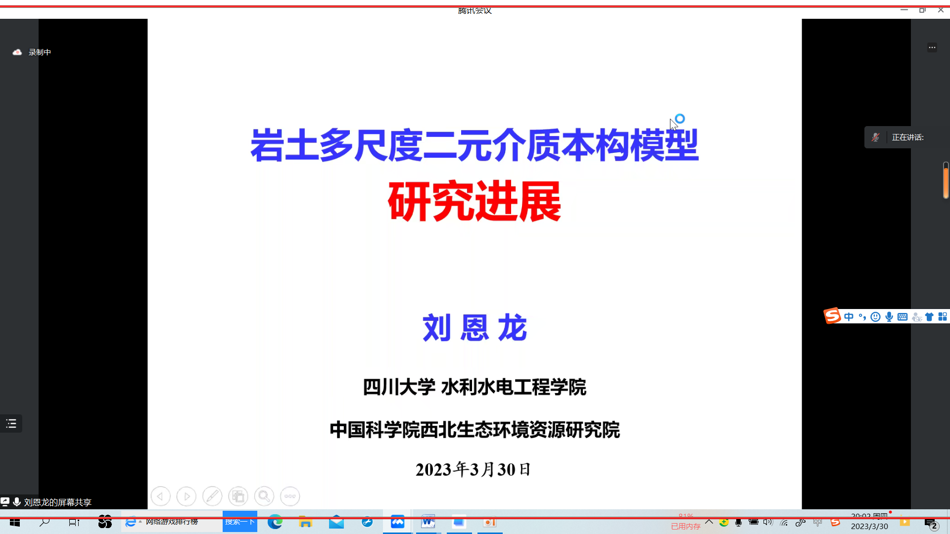 邀请,四川大学水利水电学院刘恩龙教授为我校师生做题目为“岩土多尺度二元介质本构模型研究进展”的线上学术报告。报告由刘海峰副院长主持,德州扑克平台排名