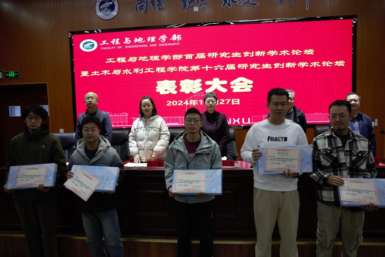表彰大会在庄严的国歌声中拉开序幕。学院副院长刘海峰介绍了本次研究生创新学术论坛的基本情况。工程与地理学部副部长、土木与水利工程学院院长毛明杰宣读了表彰决定及受表彰人员名单。出席大会的领导为受表彰研究生代表颁发了荣誉证书和奖品�