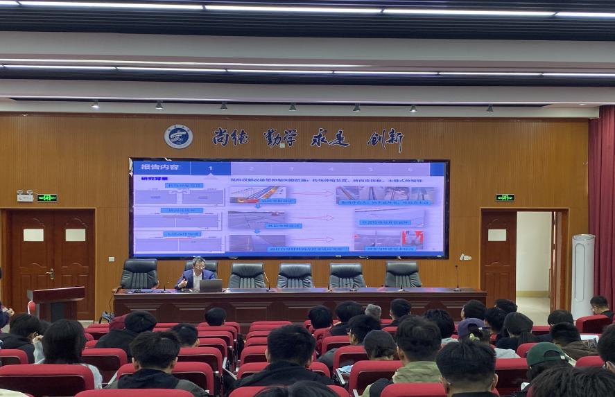 在报告中,黄福云教授详细介绍了无缝桥研究的发展历程和前沿动态。针对现有桥梁伸缩装置易损坏、难修复的行业痛点,团队基于变形性能设计理念提出了一种新型的无缝桥桥面连接构�-FEBD无缝桥面连接板,该技术已在基本力学性能、受弯性能、变形协调性能、疲劳性能、工型胀缝填料以及弹性体材料路用性能等六大方面通过严谨的科学实验和数据分析。目前,该技术已在福建、江西、上海等地的桥梁工程中获得成功应用,显著提升了行车安全性和桥梁使用寿命。特别值得注意的是,在极端条件下的测试表明,FEBD连接板展现出卓越的适应性,为其在西北地区的推广应用奠定了基础。在报告会上,黄教授深入浅出的讲解、富有激情的演讲,赢得了在场师生的热烈反响,激发了师生们的热情�