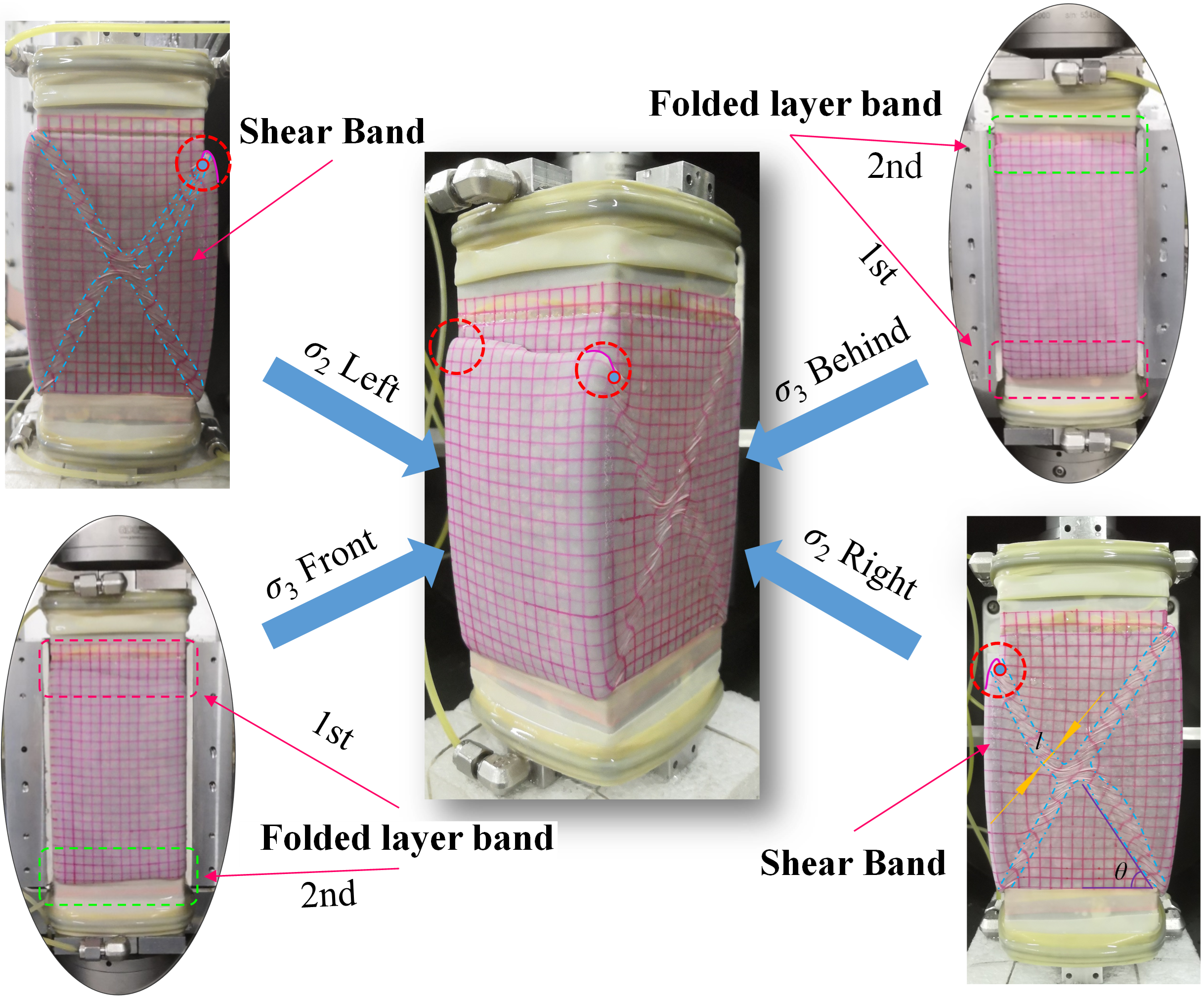 在此项工作中,研究团队考虑了多种影响因素下应变局部化对砂土真三维变形和强度特性的影响�1)定量表征了局部化变形导致的剪胀性、破坏与临界状态线相较于均匀变形存在的明显差异�2)对不同排水条件下,剪切带的形成时刻及应力-应变关系对剪切带发展的响应进行了讨论,归纳了应变局部化影响下软化的类型�3)对试验测得的剪切带宽度和倾角进行统计,分析了控制因素对其影响,并给出了理论计算剪切带倾角的建议性方法�4)依据试验现象总结了剪切带的形成机理。研究成果突破了多数传统双轴试验无法监测中主应力或监测仅为局部土体的限制,将应变局部化描述由二维扩展至三维应力空间�