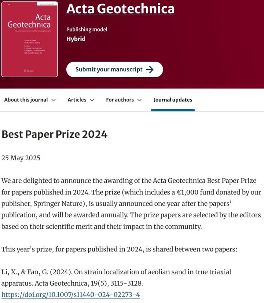 据悉,该研究成果获得了岩土工程研究者的广泛引用,荣获国际岩土工程旗舰期刊Acta Geotechnica2024年度最佳论文奖�