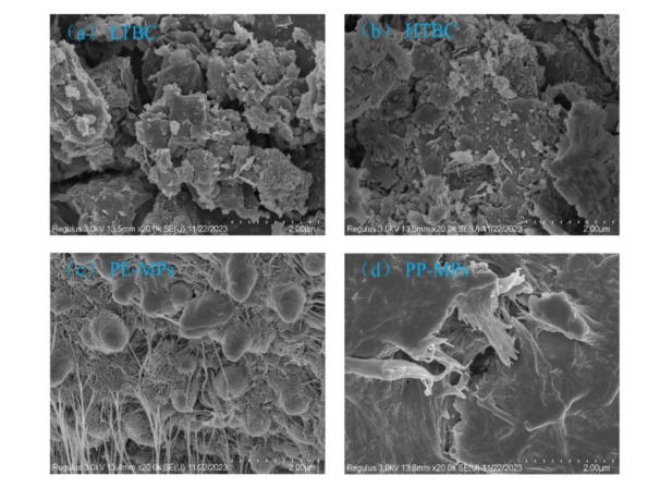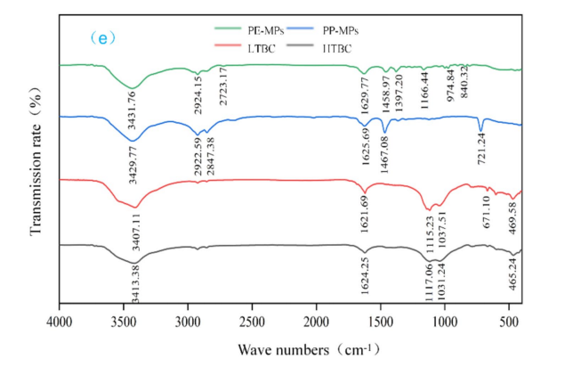 图1.生物炭(BC)和微塑料(MPs)的微观形态与官能团特征。包含扫描电子显微镜(SEM)图像(a,b,c,d)和傅里叶变换红外光谱(FTIR)图(e)。