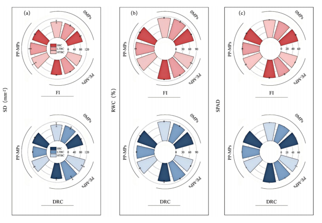 HTBC与PP-MPs的组合对根系组织密度和叶系形态产生负面或中性影响,尤其在DRC条件下更为明显。