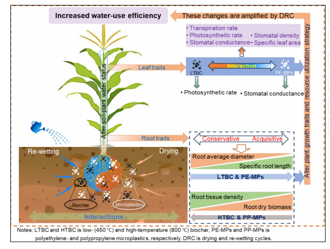低温生物炭(LTBC,450℃热解)在微塑料污染土壤中能通过交互作用提高玉米的水分利用效率(WUE);而高温生物炭(HTBC,800℃热解)则产生不利影响,尤其在添加聚丙烯微塑料(PP-MPs)的土壤中。
