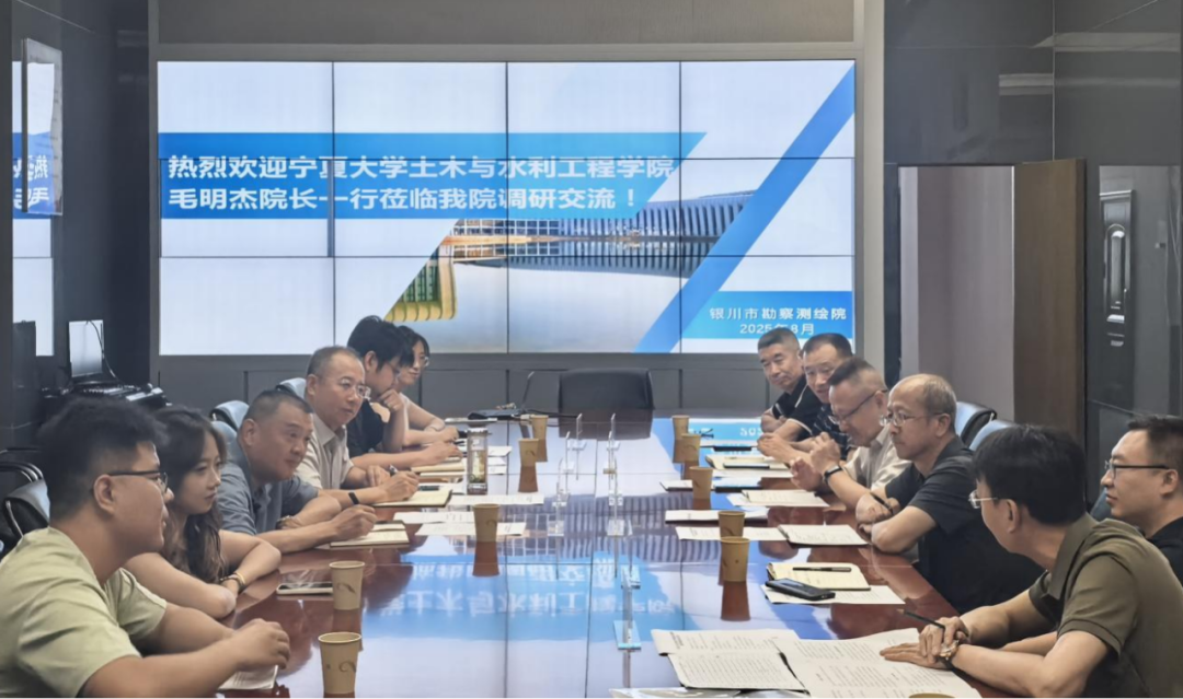 副院长刘海峰、道桥系支部书记许鹏及马熙伦主任、林卫公副教授、江大庆教授,与银川市勘察测绘院院长董军、副院长王晓星、李涛等领导共同探讨了深化实习基地建设、联合科研项目攻关、推动技术成果转化及促进人才联合培养等关键议题,就建立常态化互动机制达成重要共识。