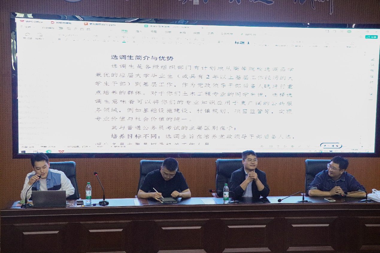 蔺澍茂副科长的分享内容详实、极具针对性。他首先为同学们梳理了“公务员”与“选调生”的概念区别与联系,明确指出选调生作为党政领导干部后备人选的战略性培养目标,其报考门槛、竞争维度与发展前景的特殊性。他结合宁夏回族自治区及银川市的最新人才政策,详细解读了近年来选调生招录的专业倾向、名额分配趋势以及对于“双一流”高校和本地优秀学子的不同政策倾斜。他特别分析了土木工程等工科专业在城乡建设、项目管理等岗位上的需求优势,鼓励同学们将专业所学与公职岗位需求相结合,树立专业自信。针对大一、大二学生,他强调重在积累,核心任务是学好专业知识、积极参与学生工作与社团活动以锻炼组织协调能力、积极申请加入中国共产党以提升政治素养。对于大三、大四学生,他建议全力冲刺,系统学习行测、申论知识,并关注半年到一年内的时政热点。