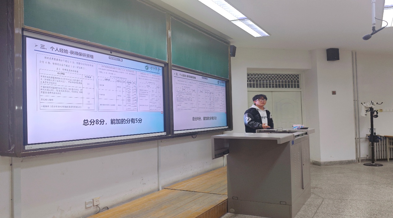 保研至浙江大学的曾天赐,围绕“投入与产出是否对等”、“保研与考研的差异”等问题展开讲解,帮助同学们明确未来发展方向。他系统梳理了本专业的保研去向,并推荐了相关院校与学习方法,使在场同学收获颇丰。