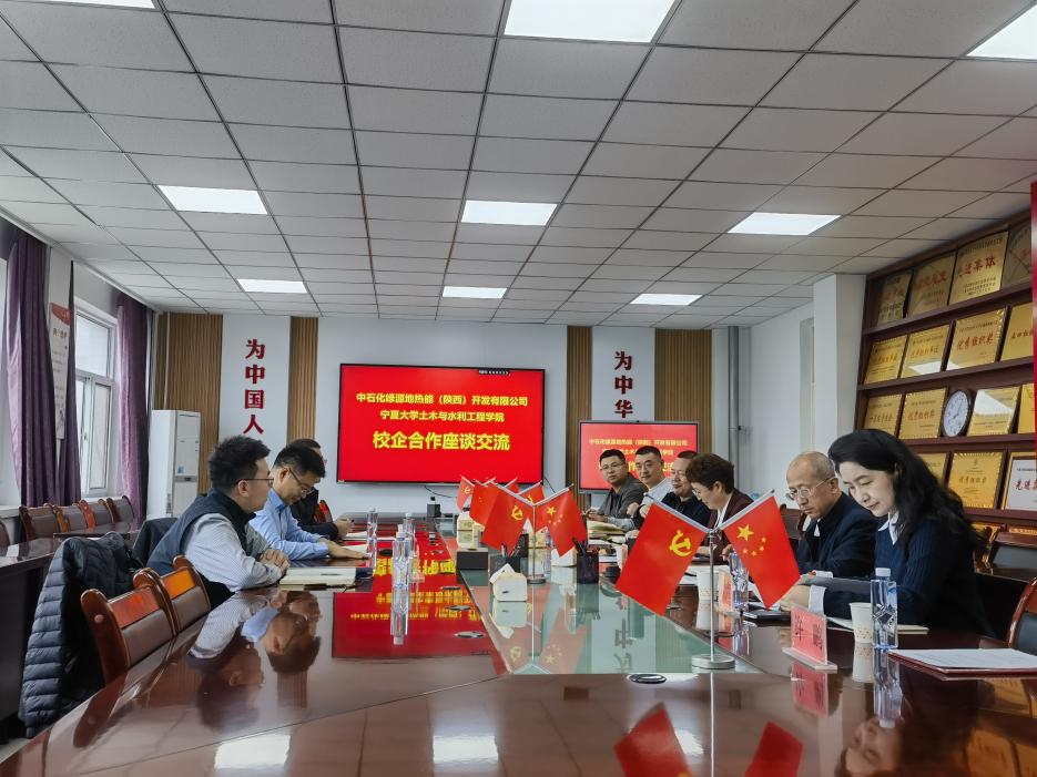 2026年3月17日上午,中石化绿源地热能(陕西)开发有限公司与宁夏大学土木与水利工程学院产学研合作座谈会在宁夏大学文萃校区知行楼415会议室举行。双方围绕地热资源开发、绿色校园建设、人才培养及科研合作等议题展开深入交流,共同探索校企协同创新发展新路径。中石化绿源地热能(陕西)开发有限公司副总经理张献喻,高级专家王鹏涛,咸阳公司副总经理王鹏,与宁夏大学土木与水利工程学院党总支书记尹娟,副院长刘海峰、李王成,党总支委员车佳玲,水利工程系党支部书记吴璞伟,水利工程系系主任丁朋朋,道路桥梁与渡河工程系党支部书记许鹏共同出席了本次活动。