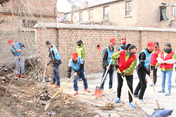 社团实践部学生协同西夏区志愿者在北京西路开展街道环境治理活动。
