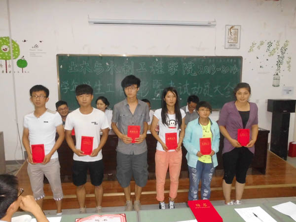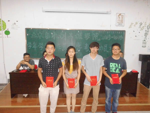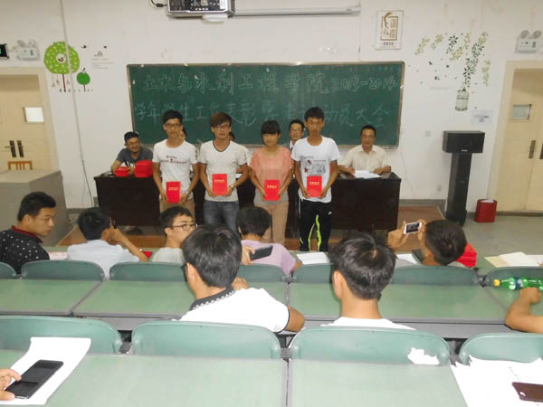 2013-2014学年学生工作表彰暨考试动员大会于C区工科楼第三阶梯教室隆重举行。土水学院党委副书记张强,学生办公室主任郭利,团委书记叶新才,2013级年级主任车佳玲,党建办公室王锋峰参加了此次会议。大会由郭利老师主持。