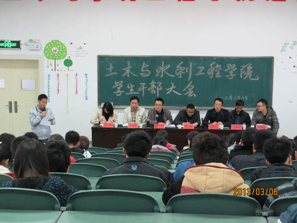 新学期伊始,土水学院于2013年3月6日在工科楼三阶教室召开了全院学生干部大会。学院党总支副书记张强老师,学办主任郭利老师及全体辅导员老师出席了本次大会。第九届团委、学生会干部和各班主要班干部参加了此次大会。大会由郭利老师主持。