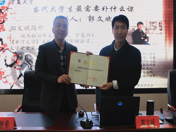 报告会之初,校友总基金会办公室主任王智勇代表学校为郭文斌颁发德州扑克平台排名