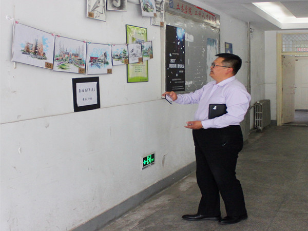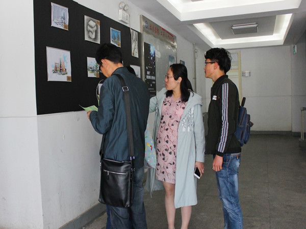 此次参展作品共包括素描、水粉、手绘、摄影、建筑模型及部分优秀建筑设计和规划作品,分为基础类、色彩类和专业类三大类。作品种类多样,内容丰富,吸引众多师生前来观赏。许多专业教师更是认真地审视作品,不时提出自己的建议和意见。来参加的同学手持选票,绕展区走动,遇到心仪的作品或驻足观赏,或低声讨论,思索许久之后才在选票上认真填上自己喜欢的展品编号。负责场务工作的同学更是面带微笑,详细耐心地回答师生的各个问题,同时又要兼顾场上展品的布置摆放以及选票的收集统计。