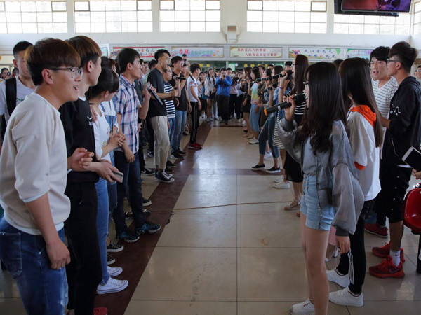 喧嚣的二餐里,同学们如往常一样吃着午餐。然而,此时飘来的不仅仅是饭香,还有突然响起的音乐。伴着舒缓的音乐,手拿话筒的12名同学从餐厅各个方向走来。一首《北京东路的日子》带着淡淡的哀愁,将大家带入回忆的思潮。毕业和成年的字眼,格外扣人心弦,而我们《不说再见》。你那么《美》,爱上你是我《情非得已》。掌声、欢呼声、唱和声将气氛推向高潮。餐厅的走道变成了大家挥舞激情的舞台,受到感染的同学纷纷站起身走向中央,其他同学则是聚在周围。此刻,“土水有你,相伴一生”不仅是被举起的简单字眼,更是每一个土水人心上的烙印。穿过《平凡之路》,每个人都在期盼着《See you again》。