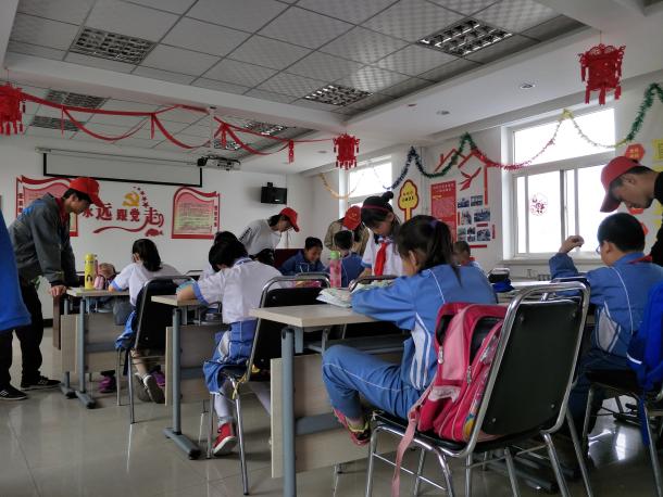 志愿者一队人来到西夏小区活动中心,与孩子们一起完成作业,一起跳绳玩耍,为孩子们带来了多姿多彩的特色课堂。