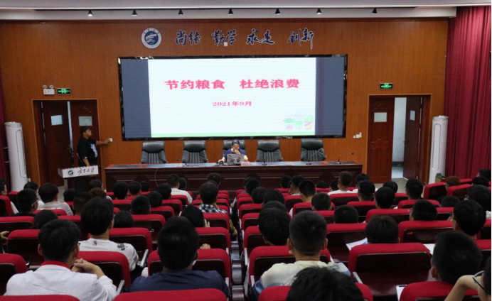 在知行楼三楼阶梯教室组织召开关于杜绝餐饮浪费的入学教育讲座。后勤保障部饮食服务中心张萌菁老师主讲,2021级本科生参加。