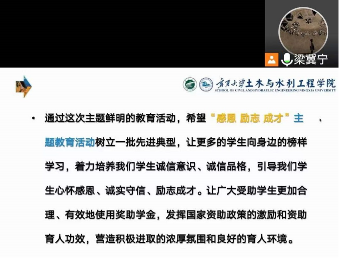 为进一步发挥学生资助工作的育人和导向功能,增强青年学生感恩意识、诚信意识和责任意识,展现新一代大学生的青春奋斗风采,激励广大受助学生奋发自强、立志成才、感恩奉献。学院通过优秀学生事迹宣传、家庭经济困难学生学业帮扶等形式在全院本科生中开展“感恩 励志 成才”主题教育活动。