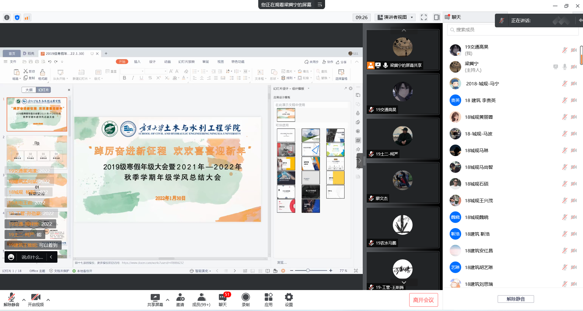 2019级寒假年级大会暨2021-2022学年秋季学期年级学风总结大会在线上腾讯会议召开。2019级全体本科生和2018级建规系本科生参会,会议由2019级本科生辅导员梁冀宁主持。