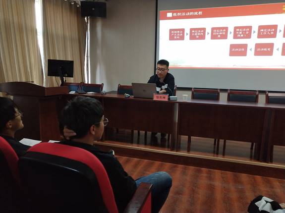 首先,郜英洲围绕“你为什么要成为学生干部,你认为学生干部真的是干部吗,你认为什么是学生干部”等三个问题进行了讲解,接着为大家播放了有关采访学生干部的视频,郜英洲还分享了自己从面试学生会失败到最终成为一名学生会主席的经历,并以自己的经验详细介绍了组织活动的流程。最后,他希望全体学员能够热爱工作,耐心为同学服务,做勇于创新的优秀学生干部。