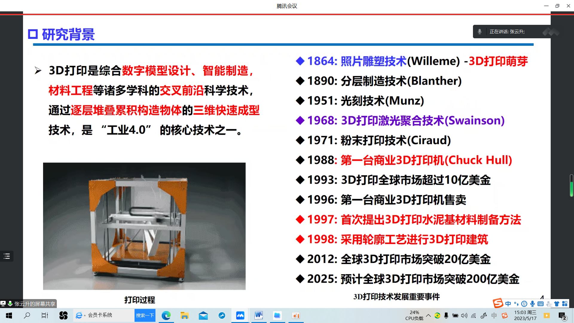 3DPC作为高度契合我国“碳达峰、碳中和”的发展新技术,能减少建筑施工中模板工程,具有绿色低碳的显著优势。张云升教授首先讲述3DPC发展历史和现状,其次结合自己的研究成果,详细讲述3DPC装备的设计与制造、可打印性能、流变性能、力学性能、耐久性、掺粗骨料的3DPC和工程应用以及未来的应用前景。